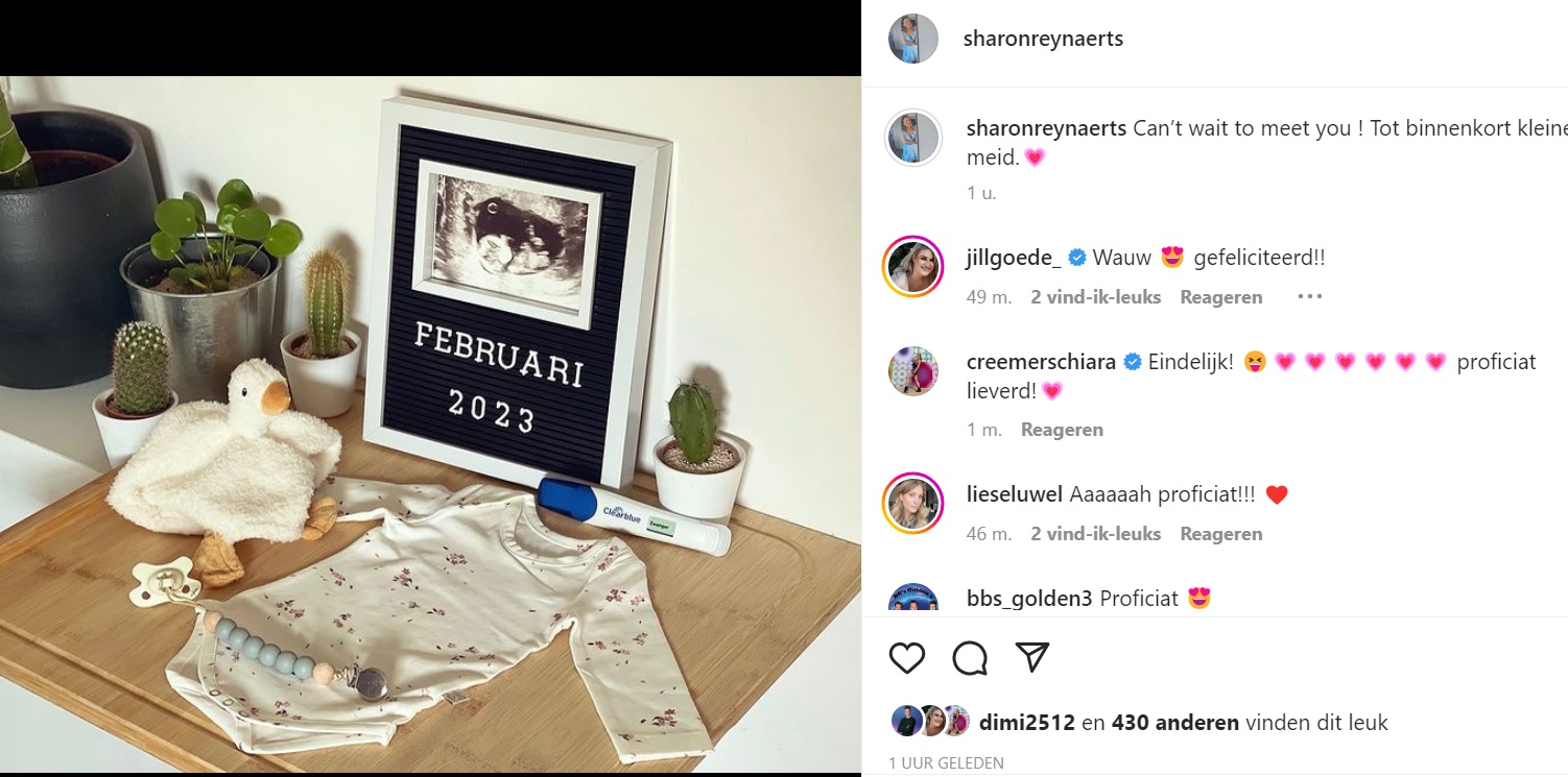 Zijn vriendin Sharon Reynaerts meldt op Instagram het heugelijke nieuws dat ze in verwachting is! “Can’t wait to meet you. Tot binnenkort kleine meid”, schrijft ze bij een foto waarop we zien dat ze in februari 2023 uitgerekend is.