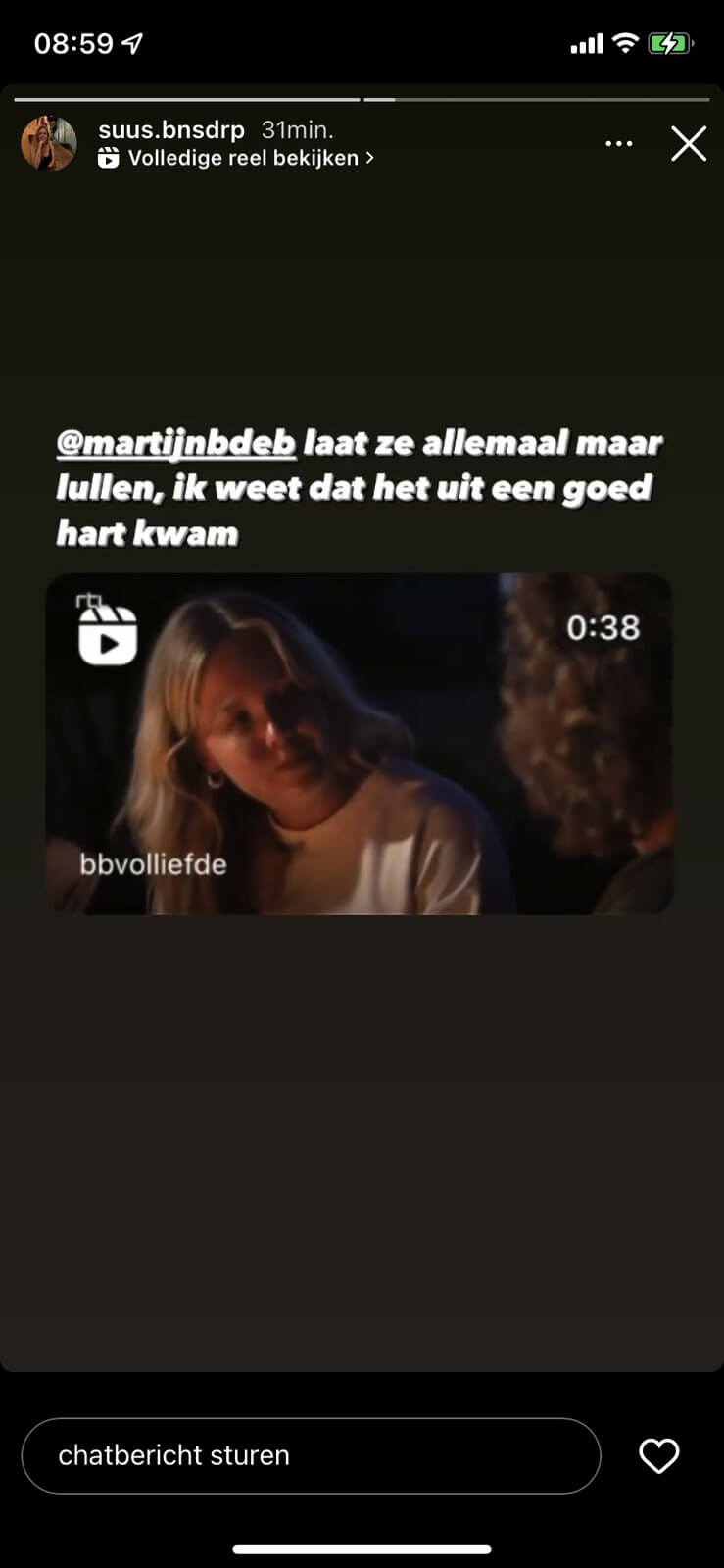 Het zag er op beeld nogal ongemakkelijk uit en Eva van Riet benoemde het moment zelfs tot meest ongemakkelijke tv-moment aller tijden. Suus maakt zich er echter niet zo druk om en verdedigt Martijn dan ook. “Laat ze allemaal maar lullen, ik weet dat het uit een goed hart kwam”, aldus Suus. Dat is wel heel erg lief. In de komende afleveringen moet blijken of Martijn en Fenna inderdaad samen eindigen.
