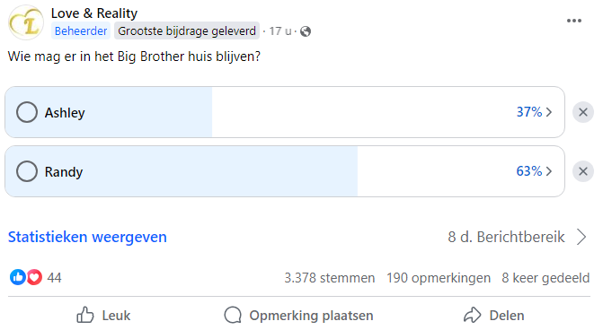 Want sinds zondagmiddag zijn de stembussen weer geopend en die sluiten maandagochtend om 10 uur. Randy en Ashley zijn genomineerd. Als we de polls mogen geloven is het voorbij voor Queen Ashley. De cijfers schommelen, maar zijn overall zo’n 60% om 40% in het voordeel van Randy. En daar zit wel het verschil, want in procenten was het verschil tussen Randy en Tom dit weekend een stuk kleiner…. Maandag in de loop van de ochtend volgt het verlossende antwoord!