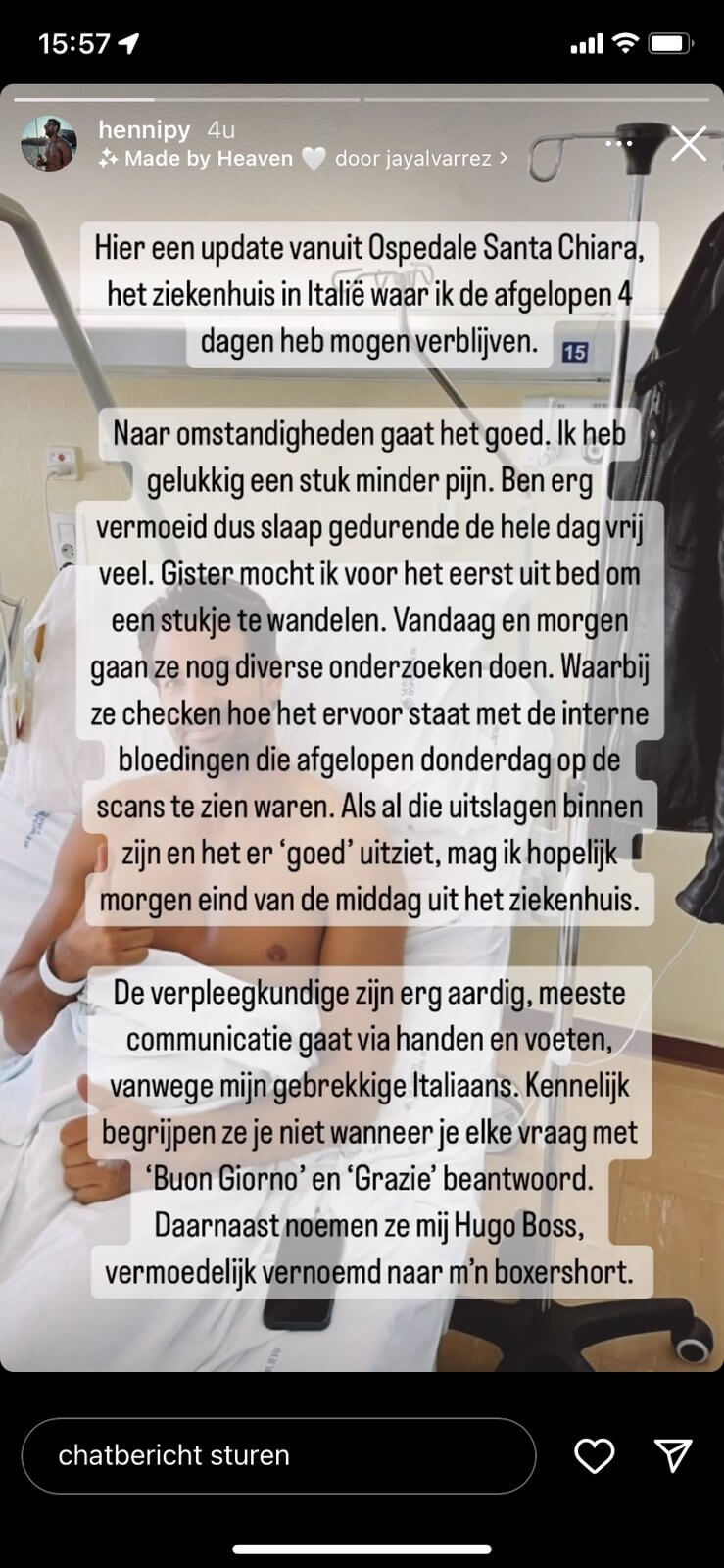 Michel ligt momenteel nog in Ospedale Santa Chiara in Italië. “Naar omstandigheden gaat het goed. Ik heb gelukkig een stuk minder pijn. Ben erg vermoeid, dus slaap gedurende de hele dag vrij veel. Gister mocht ik voor het eerst uit bed om een stukje te wandelen. Vandaag (zondag, red.) en morgen (maandag, red.) gaan ze nog diverse onderzoeken doen.” Daarbij wordt gecontroleerd hoe het gaat met de interne bloedingen die op donderdag op scans te zien waren.