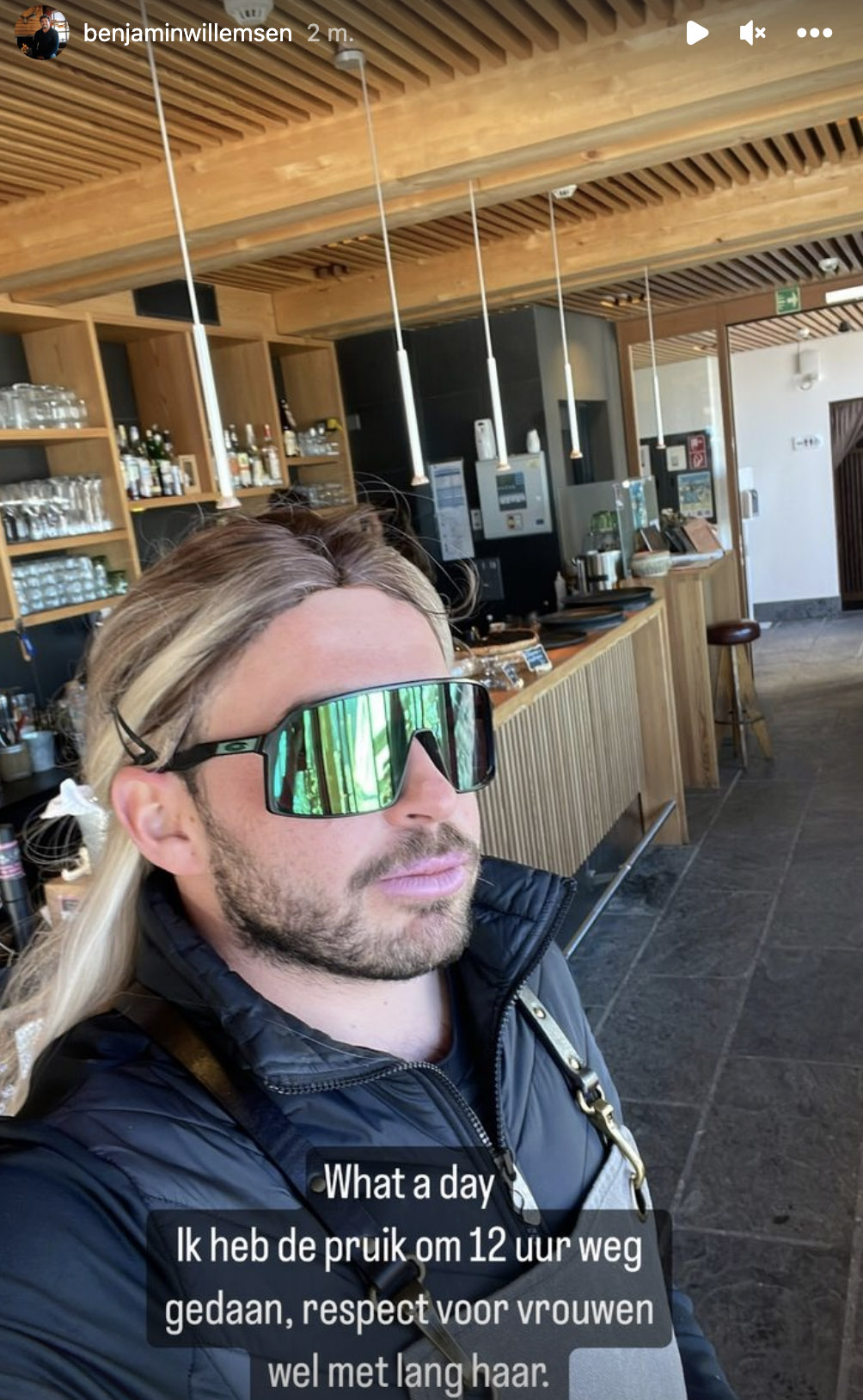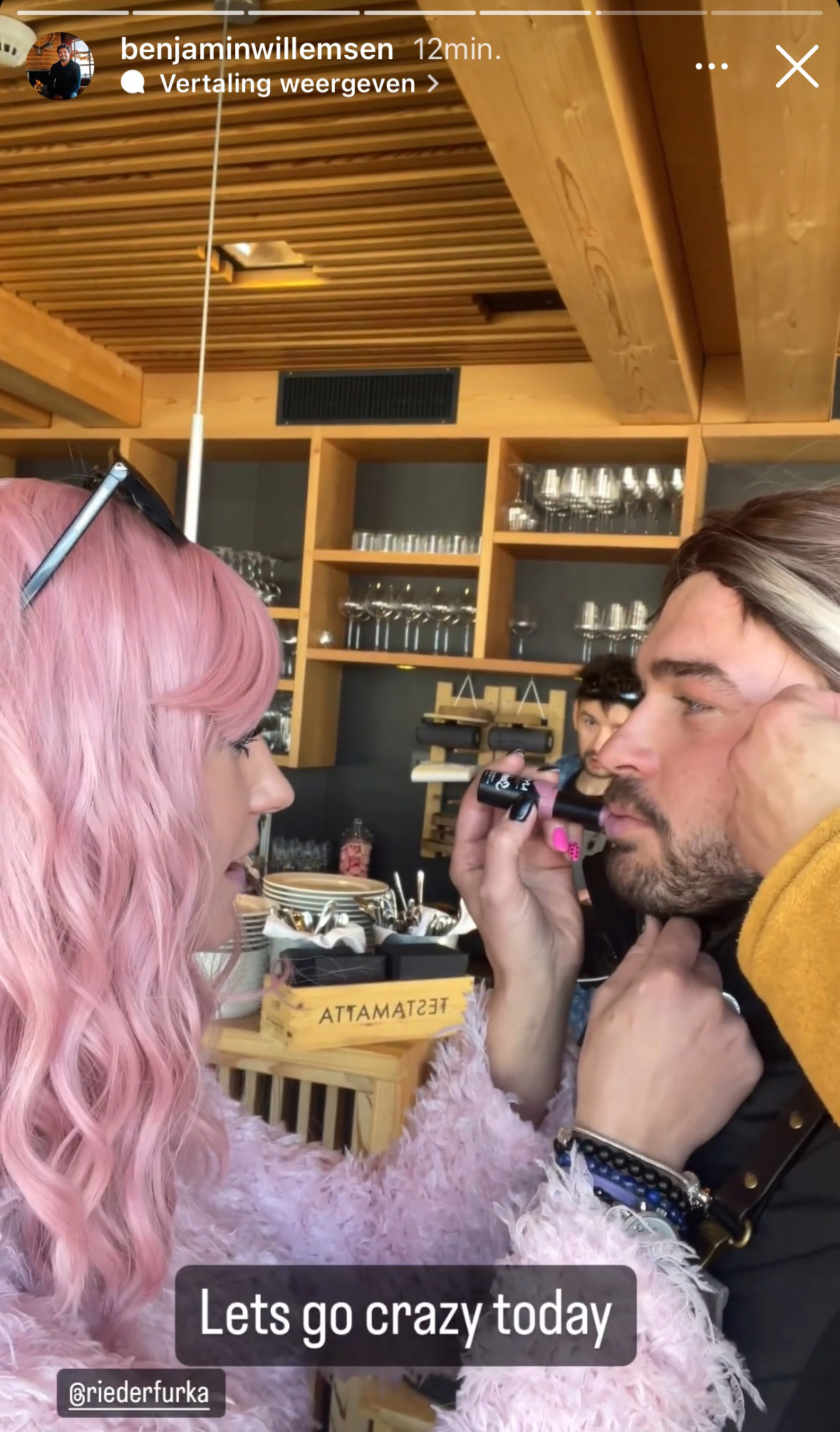 Op zijn Instagram-account neemt Benjamin zijn volgers mee naar een bijzonder moment. Benjamin is voor een feestje namelijk omgetoverd tot vrouw. Op zijn Instagram story zien we dat Benjamin een lange pruik draagt en roze lippenstift op heeft. Hij schrijft erbij: “Let’s go crazy today.”