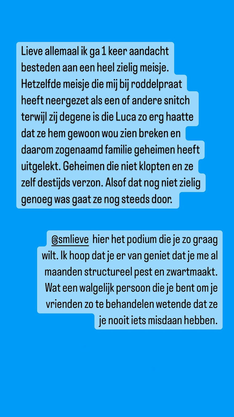 Daisy haalt verder uit naar een voormalige vriendin, Lieve, die haar ‘al maandenlang pest en zwartmaakt’. Deze Lieve zou ook inside information over de familie Borsato gelekt hebben naar Jan Roos, van Roddelpraat. “Geheimen die niet klopten en ze zelf destijds verzon.”
