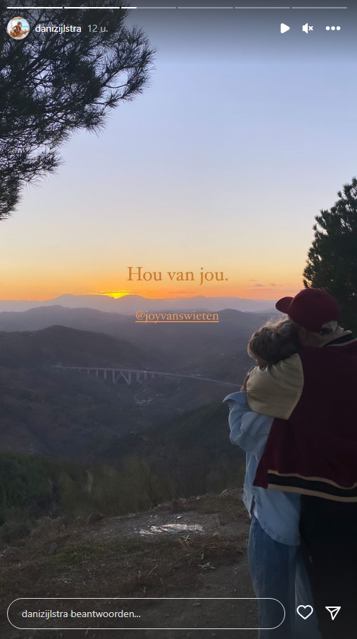 In haar Instagram Story plaats Dani een foto waarop ze uitkijkt op een prachtig landschap. Aan de horizon zien we nog net de ondergaande zon. Ze ligt in de armen van Joy. “Hou van jou”, schrijft ze bij de foto. Een super lieve boodschap.