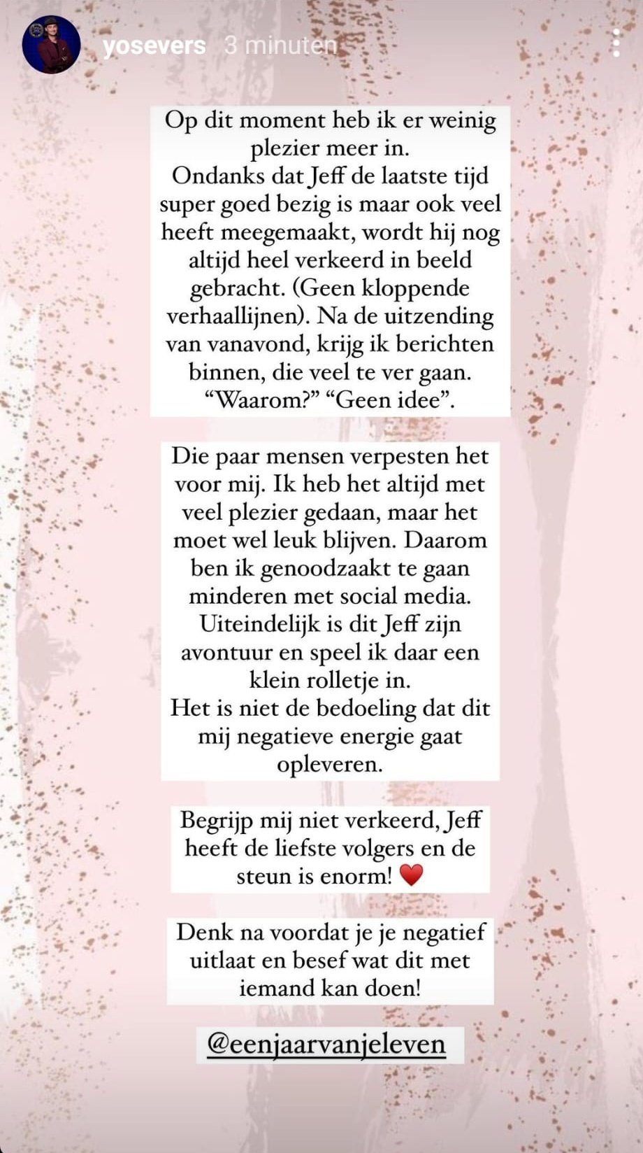 Het thuisfront van Jeff krijgt daardoor ook veel negatieve reacties van kijkers binnen. En dat noodzaakt hun nu om te minderen met de sociale media, omdat alle vervelende reacties hen niet in de koude kleren zijn gaan zitten.. Lees het uitgebreide statement op de Instagram-pagina van Jeffrey hieronder.