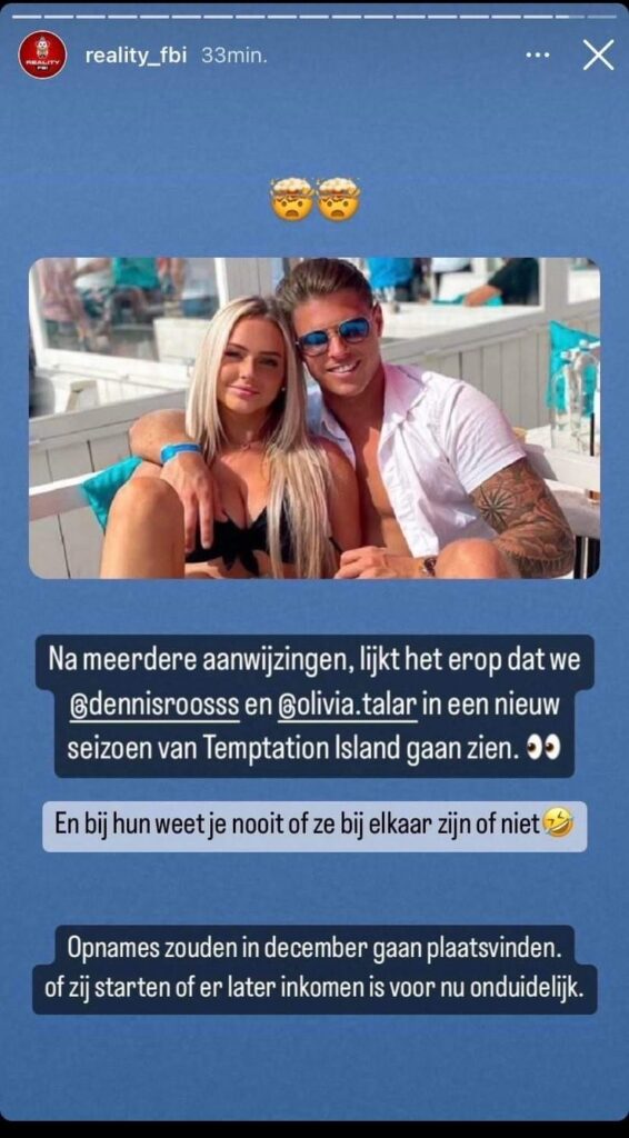 Volgens bronnen van juicekanaal Reality FBI gaan Dennis en Olivia namelijk misschien wel meedoen aan het komende seizoen van Temptation Island, dat in december aanstaande opgenomen wordt.