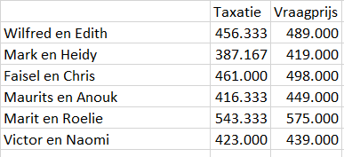 Want doordat er geen appartementen verkocht waren besloten de makers om drie taxateurs op de woningen af te sturen. Het gemiddelde bedrag werd genomen als verkoopbedrag. Opvallend genoeg zijn de taxaties in alle gevallen fors lager dan de daadwerkelijke vraagprijs. Dit verschilt bij alle woningen al snel zo’n dertigduizend euro. Is de verkoopmakelaar iet gewoon veel te hoog in de boom gaan zitten? Hieronder een overzicht van de taxatiecijfers en de vraagprijs.
