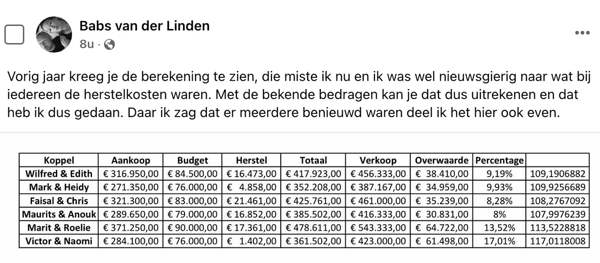 Een kanttekening bij deze cijfers is wel dat het gewonnen prijzengeld bij de opleveringen niet is door verwerkt en we niet weten of de koppels zich aan hun bouwbudget hebben gehouden. Naomi en Victor zeiden zelf zo’n vijfduizend euro over te houden, dus dan is er nog wel meer herstelwerk gedaan. Maar een duidelijk overzicht hiervan hebben we niet gekregen tijdens Het Blok. Onderstaande overzicht geeft in ieder geval meer inzicht hoe de koppels het uiteindelijk hebben gedaan.