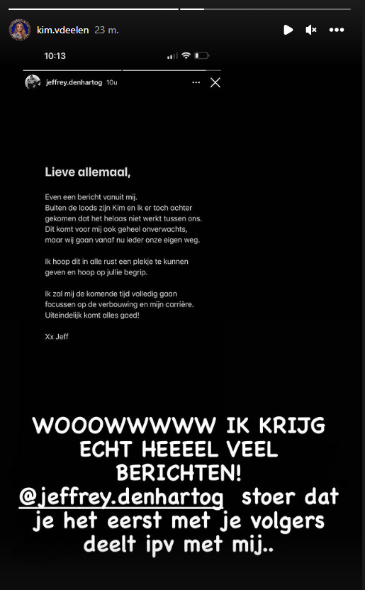 Kim was naar eigen zeggen helemaal niet op de hoogte van de actie van Jeffrey. Sterker nog, ze wist nog niet eens dat het uit was, blijkt uit een post op Instagram. “Wow, ik krijg echt heel veel berichten! Jeffrey, stoer dat je het eerst met je volgers deelt in plaats van met mij”, reageert Kim nu.