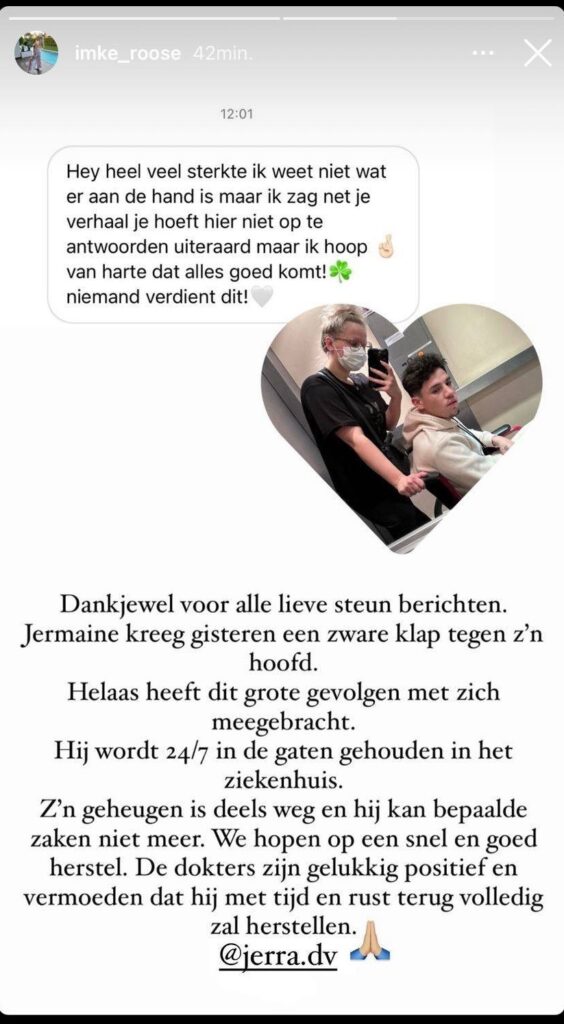 Zo meldt Imke dat Jermaine een zware klap tegen zijn hoofd heeft gekregen, en dat die klap ‘grote gevolgen met zich mee heeft gebracht’. Jermaine wordt 24/7 gemonitord in het ziekenhuis en zijn geheugen is deels weg. De twee ‘hopen op een snel en goed herstel’, de dokters geloven in een volledig herstel als er maar genoeg rust wordt genomen.