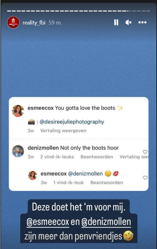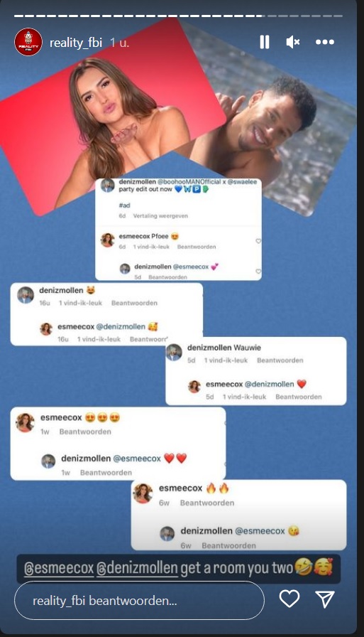 Het gaat om Deniz, die tijdens zijn Love Island-deelname veel optrok met Loesje, maar al snel na de opnames weer als single verder ging. Reality FBI heeft gesignaleerd Deniz en Esmee wel érg liefdevol op elkaars foto’s reageren, en ook regelmatig in real life samen zijn. Onder een foto waarbij Esmee schrijft ‘you gotta love the boots’, reageert Deniz met duidelijke taal: ‘Not only the boots, hoor!’