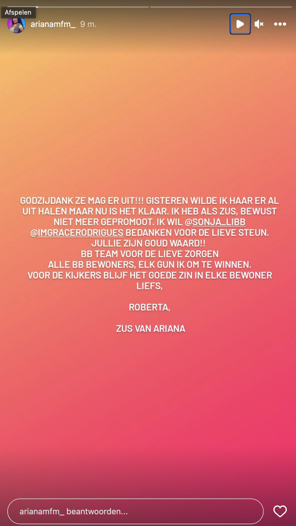 Roberta, de zus van Ariana, schrijft op Instagram: “Godzijdank, ze mag eruit. Gisteren wilde ik haar er al uit halen, maar nu is het klaar. Ik heb als zus bewust niet meer gepromoot”, legt Roberta uit. Het viel haar ongetwijfeld op dat Ariana al niet meer zo lekker in haar fel zat in het huis. Wel neemt Roberta nog de tijd om een aantal mensen te bedanken.