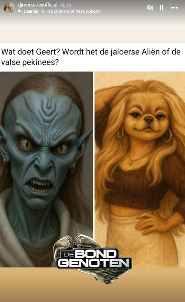 Mercedes deelt namelijk een story met de tekst ‘Wat doet Geert? Wordt het de jaloerse Alien of de valse pekinees? Daaronder zijn twee AI-afbeeldingen gedeeld die aan duidelijkheid niets te wensen overlaten.