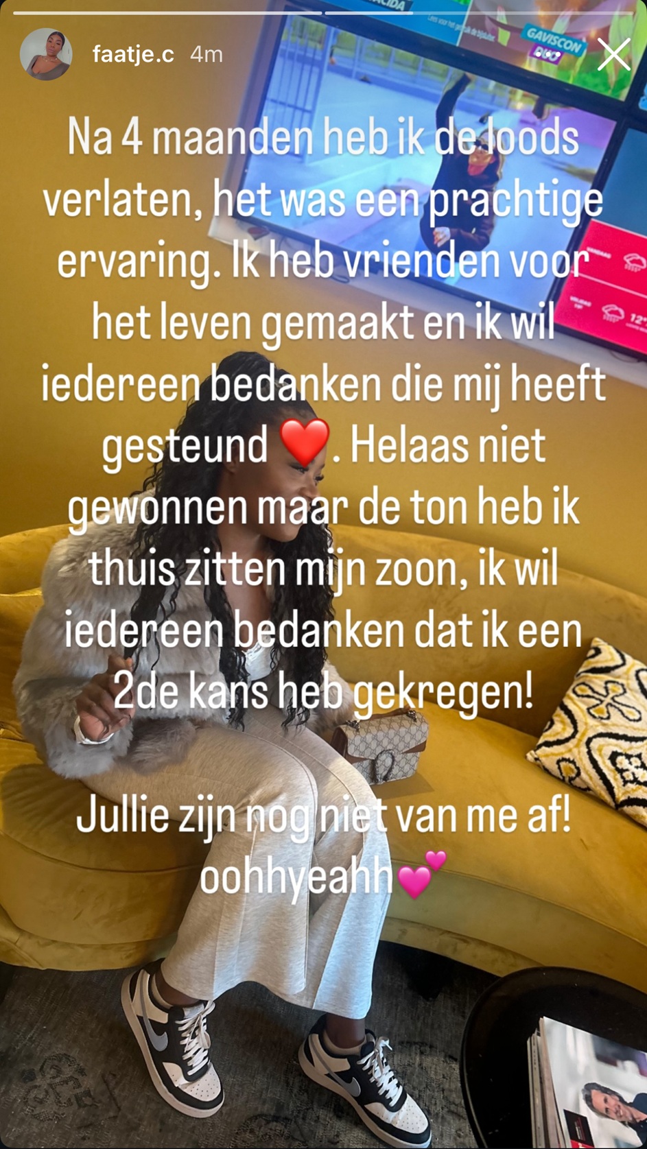 Ze vervolgt: “Helaas heb ik niet de ton gewonnen, maar de ton heb ik wel thuiszitten: mijn zoon. Ik wil iedereen bedanken dat ik een tweede kans heb gekregen. Jullie zijn nog niet van mij af”, belooft Fatima tot slot.
