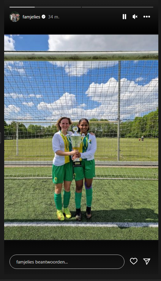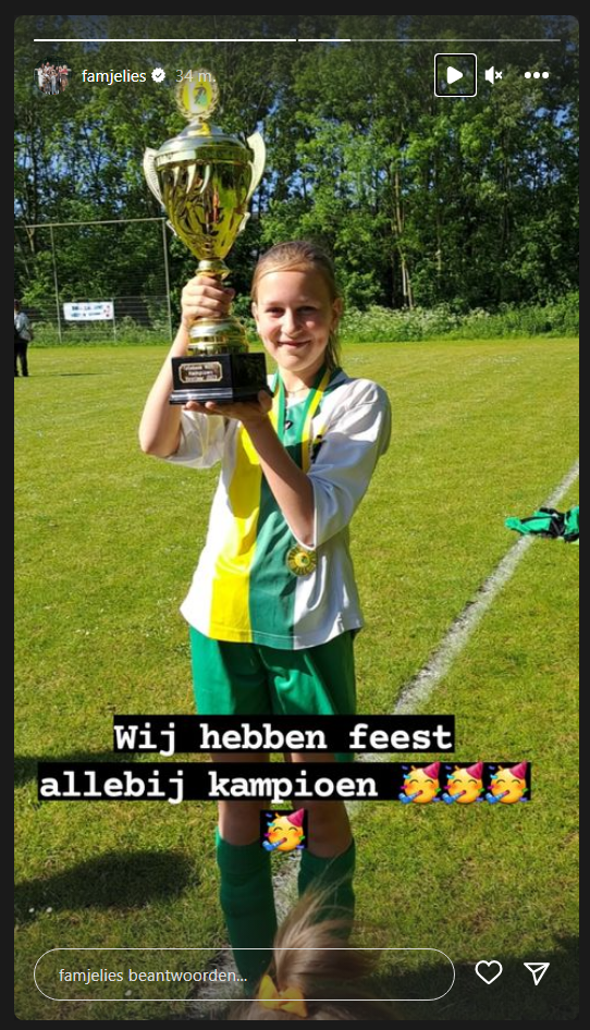 Meerdere kinderen uit de familie Jelies zitten op voetbal. Twee van de kinderen is het echter gelukt om de hoofdprijs te pakken. Aida en Albertine mogen zich namelijk kampioenen noemen. Op Instagram heeft het gezin twee foto’s geplaatst waarop de kinderen poseren met de kampioensbeker. Op de ene foto is Aida te zien met een ploeggenoot en op de andere foto straalt Albertine met de prijs in haar handen. “Wij hebben feest, allebei kampioen”, valt erbij te lezen.