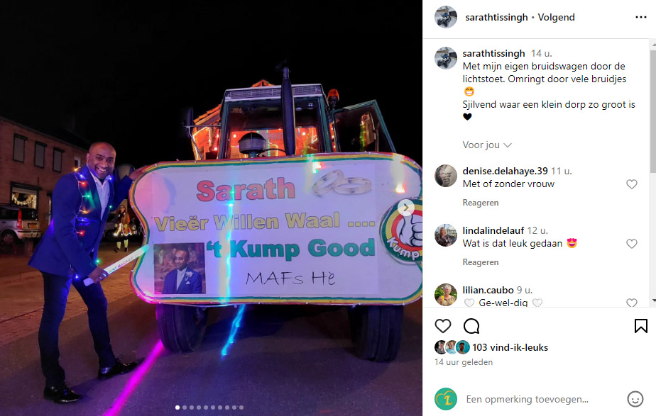 Sarath heeft op zijn Instagram-account een foto gedeeld van een bruidswagen. Achterop een tractor zien we een bord met daarop de tekst: “Sarath, Vieër willen waal… ‘t Kump Good. MAFS hè?” Hij schrijft bij de foto: “Met mijn eigen bruidswagen door de lichtstoet. Omringd door vele bruidjes. Sjilvend, waar een klein dorp zo groot is.”, aldus Sarath.