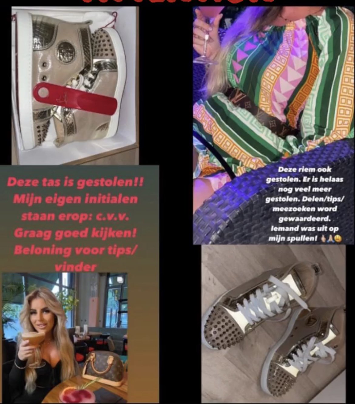 En vanwege het feit dat Cleo nogal fan is van peperdure merkkleding, is de totale waarde van de buit van de dader behóórlijk opgelopen. Het gaat van een gepersonaliseerde Louis Vuitton-tas tot Louboutin-schoenen, en van een LV-riem tot een Gucci-tas, zo somt Cleo op op Instagram.