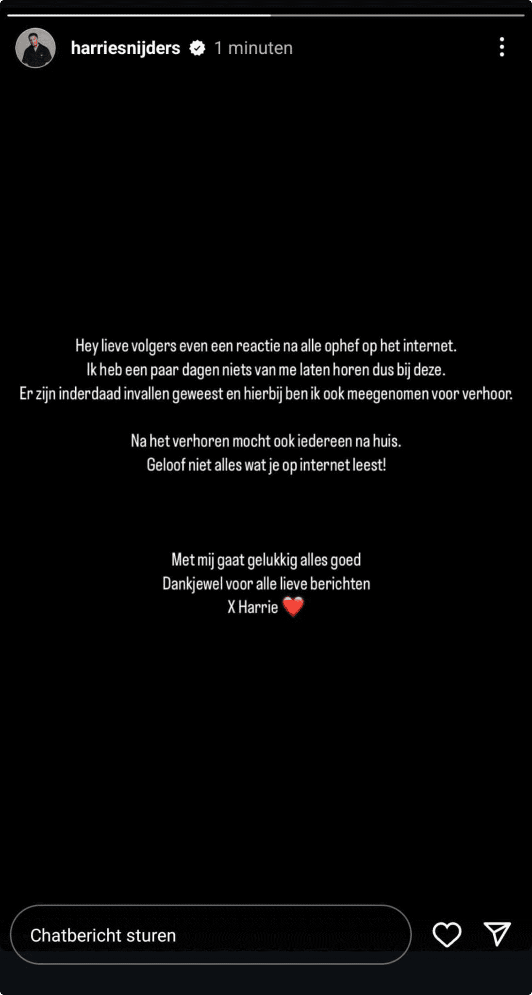 Harrie bedankt verder zijn volgers voor lieve berichten die hij kreeg. Aan Shownieuws liet de politie al weten dat de verdachten snel weer op vrije voeten zouden zijn omdat ze niet voorgeleid gingen worden. Wel moeten ze zich in de nabije toekomst nog melden bij een rechter. Omroep Brabant wist te melden dat het om een onderzoek in een drugszaak gaat.