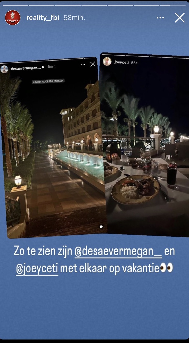 Megan en Joey vertoeven in een luxe resort in de Egyptische toeristentrekpleister Hurghada. Ze taggen elkaar niet op de foto’s van bijvoorbeeld hun heerlijke avondeten en cocktails (zouden ze hun relatie nog niet bekend mogen maken wegens hun EOTB-contract?), maar Reality FBI constateerde al dat ze wel degelijk samen op reis zijn.
