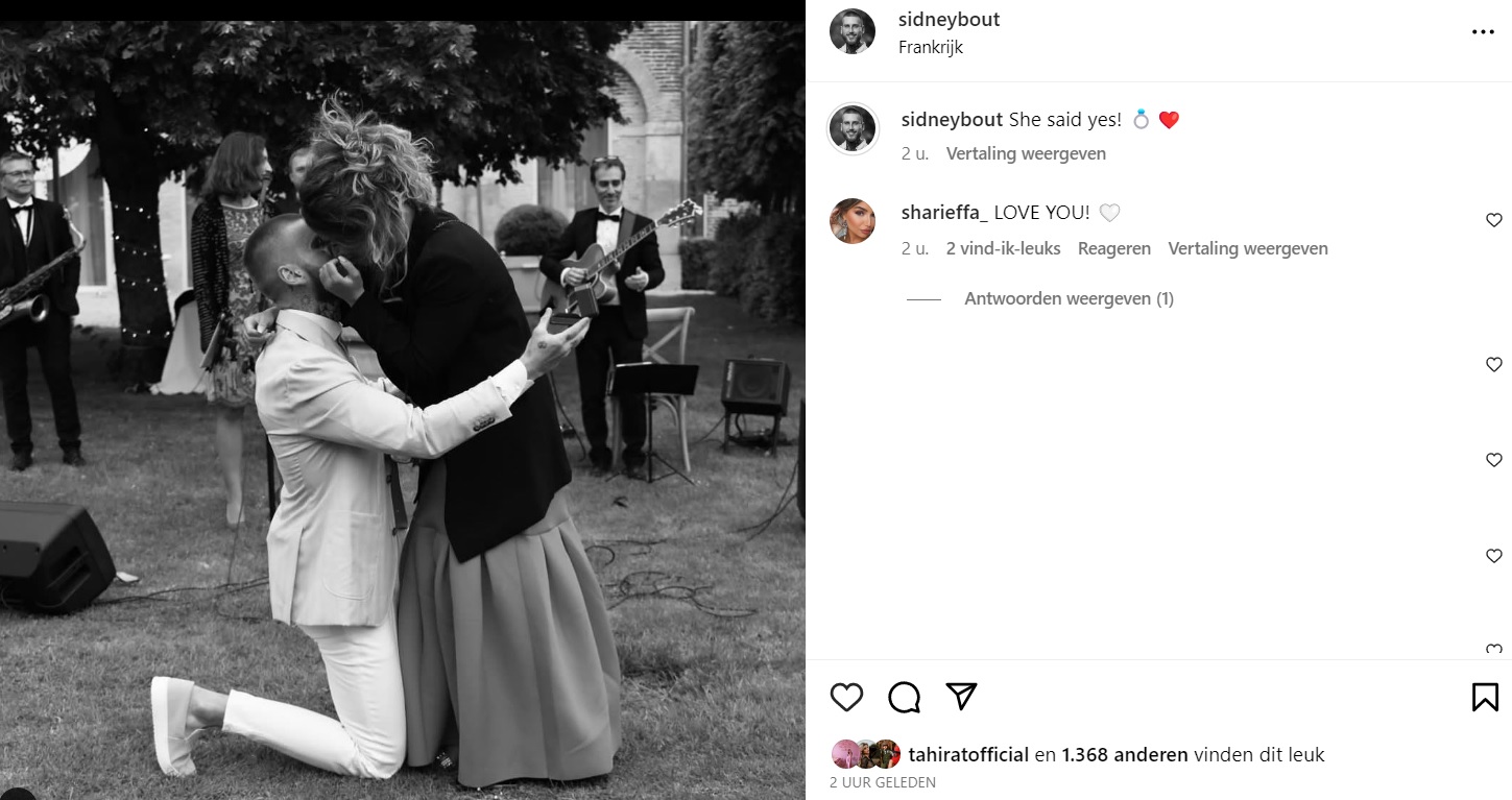 Op Instagram deelt Sidney een zoet kiekje van het moment van het aanzoek. “She said yes! 💍❤️”, schrijft hij er bij. De dame in kwestie heet Sharieffa, een knappe én intelligente dame. Ze is namelijk advocaat. Het aanzoek werd gedaan in het land van de romantiek, Frankrijk.