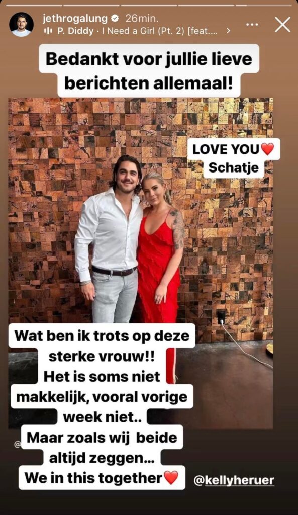 Zoontje Bodi zou een broertje of zusje gaan krijgen, maar tijdens de zwangerschap van Kelly sloeg het noodlot toe. Logischerwijs zet Jethro de blondine dan ook eens extra in het zonnetje. In zijn Instagram Story schrijft hij: “Wat ben ik trots op deze sterke vrouw! Het is soms niet makkelijk, vooral vorige week niet.. Maar zoals wij beiden altijd zeggen: we in this together. Love you schatje.”