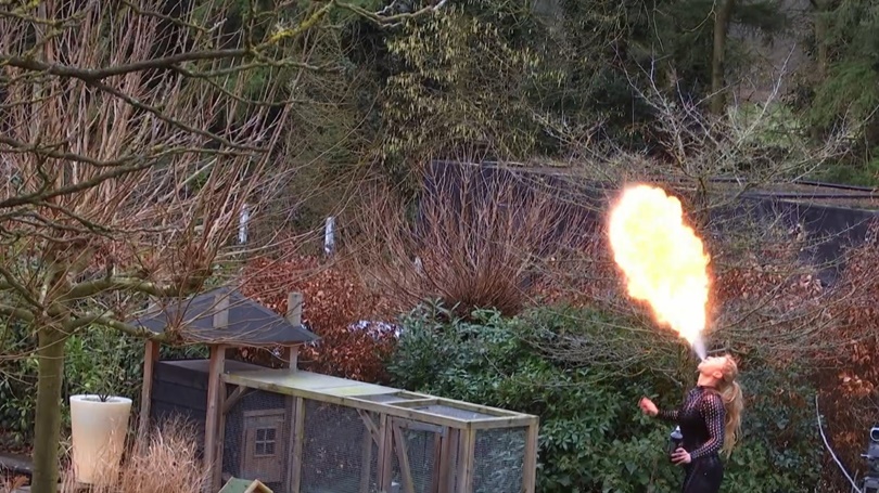 Malgorzata neemt plaats in de tuin, op haar stelten, in afwachting van Ivo. “Holy sh*t“, roept hij uit. Malgorzata: “Tadaaaaaaaaaa. Wat ben jij klein nou. Ik doe vuurspuwen en zo, dat is mijn werk, dat ga ik voor jou ook doen. Ik ben ook een paaldanseres. Stripper. Maar nu ga ik vuurspuwen!” Ze voegt daad bij woord. “Kijk uit voor die bomen, hè”, krijgt ze te horen, en: “Dat ga je toch niet doen als ik slaap…” Het antwoord: “Wel als je je ballen niet geschoren hebt…”