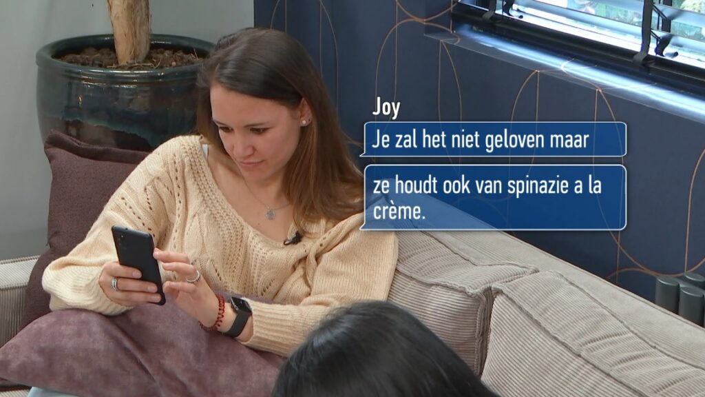 De twee hebben veel overeenkomsten, maar is Vishani Joys type wel? “Bruin haar…” “Ik heb donkerbruin, nou ja, zwart.” “Nou, het lijkt op zwart.” “Ik val heel erg voor blauwe ogen.” “O, dan ben je bij mij totaal aan het verkeerde adres.” “Nou ja, als je echt vraagt wat ik leuk vind… Blauwe ogen vind ik wel echt heel erg mooi, maar naarmate ik ouder word probeer ik wel meer naar het innerlijk te kijken dan naar het uiterlijk.” Oké oké, dus er is nog een kans… “Alleen, het blijft wel een groot ding bij mij, of zo.” Ai! En dat komt ook tot uiting als Joy whatsappt: ‘Ik voel het niet helemaal, ze is mijn type niet’, stuurt ze haar vriendin Natascha, terwijl ze notabene allebei van spinazie à la crème houden! Ook Vishani is aan het whatsappen, maar is vele malen positiever…