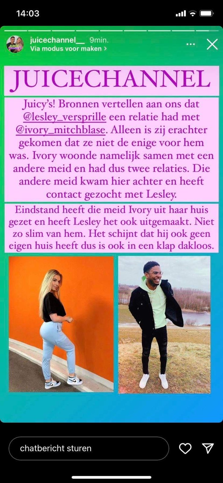 Naar verluidt heeft Lesley Versprille de afgelopen weken – of zelfs maanden – een relatie gehad met Ivory, die we ook kennen van Ex on the Beach: Double Dutch. Inmiddels is de romance echter abrupt afgebroken, en wel door ontrouw van Ivory. Dat melden bronnen aan Juice Channel. Het zou er allemaal vrij heftig aan toegegaan zijn. Ivory kwam in EOTB als ex van Romée en deed ‘het’ in de villa onder meer met Lynn.