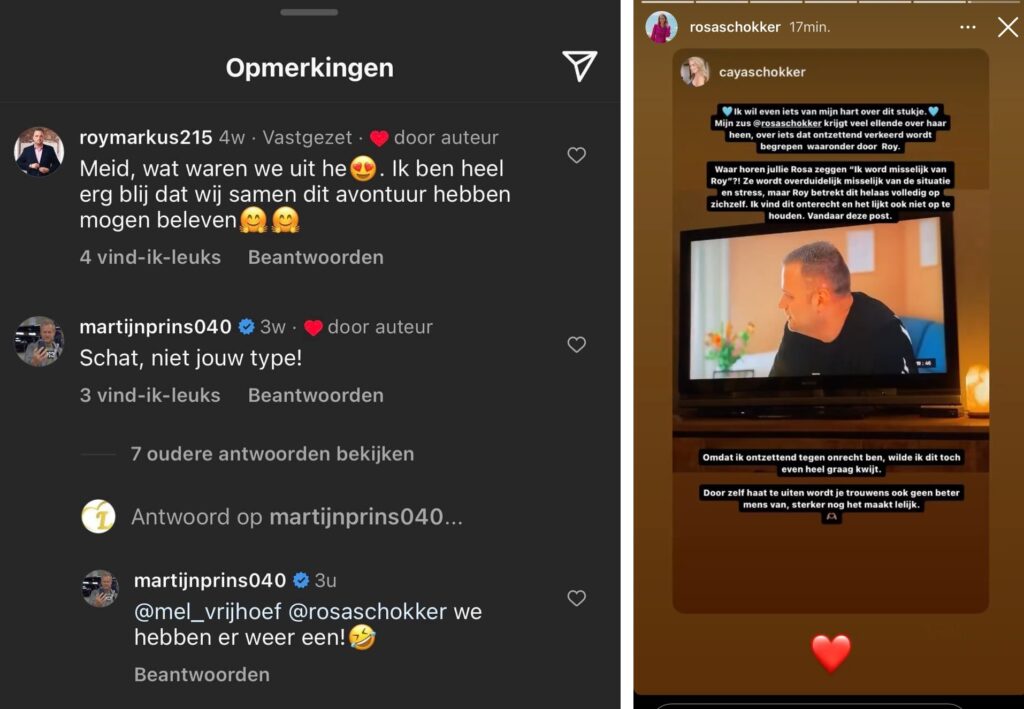 Onder diezelfde foto reageert Roy zelf overigens: “Meid, wat waren we uit hè! Ik ben heel erg blij dat we dit avontuur samen hebben mogen beleven.” En ondertussen neemt de zus van Rosa, Caya, het voor haar op: “Ik wil even iets van mijn hart. Mijn zus Rosa krijgt veel ellende over zich heen, over iets dat ontzettend verkeerd begrepen wordt. Waaronder door Roy.” Het gaat over het fragment waarbij Rosa zegt dat ze ‘misselijk wordt als ze met Roy in één ruimte is’. Zus Caya benadrukt dat Rosa misselijk werd van de situatie an sich, en niet van Roy zelf. “Helaas betrekt Roy dit volledig op zichzelf. Ik vind het onterecht en het lijkt ook niet op te houden”, aldus Caya tot slot.
