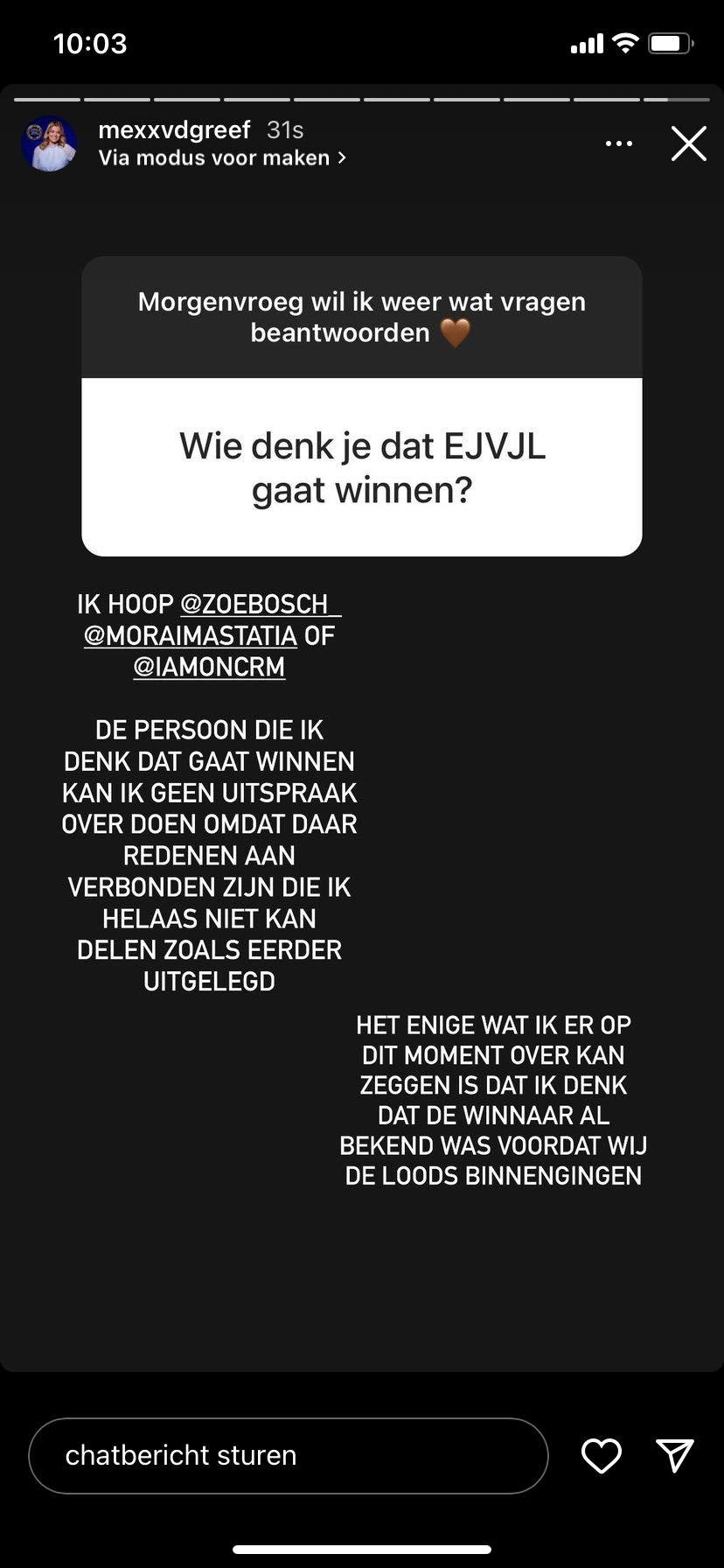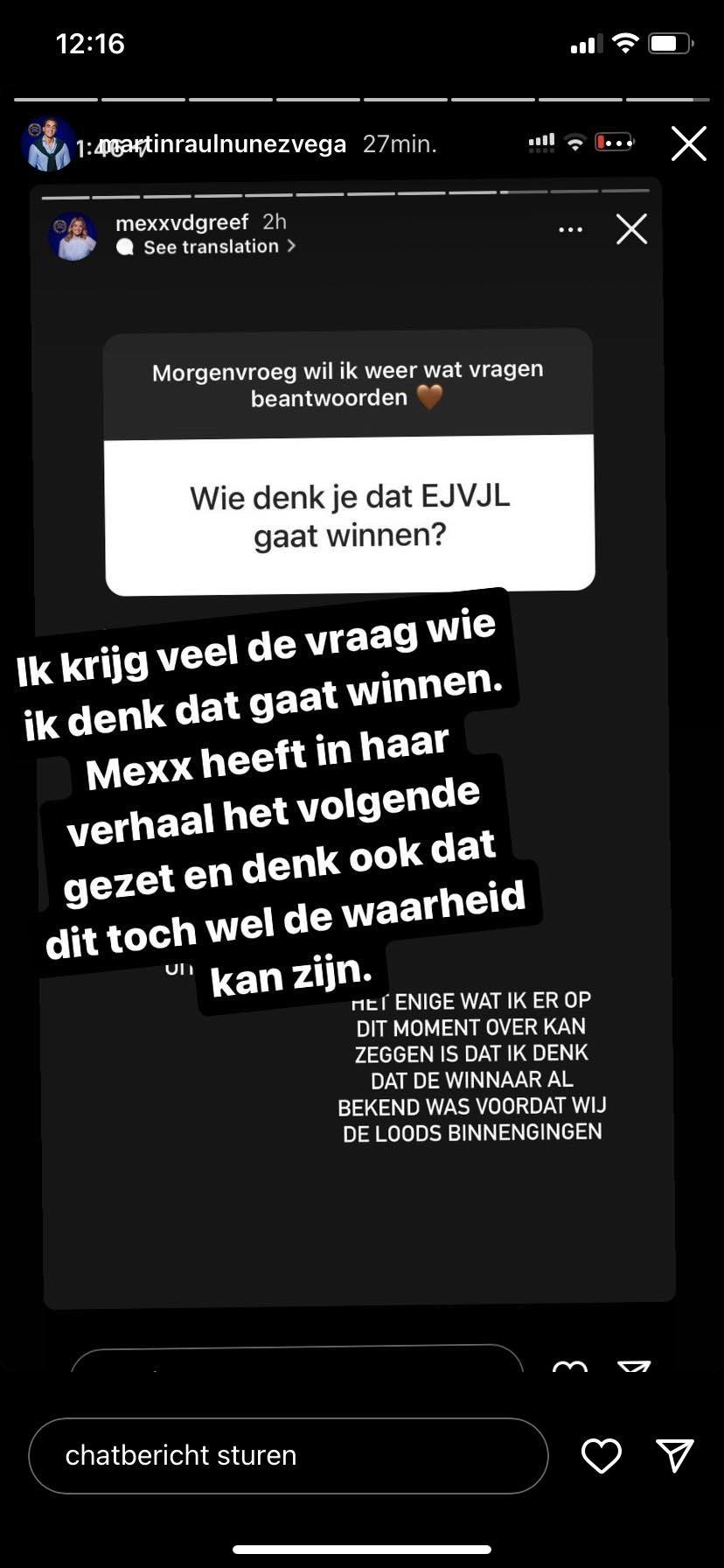Want volgens Mexx staat stiekem allang vast wie dat wordt. Ze ‘denkt dat de winnaar al bekend was, nog voordat wij de loods binnenkwamen’. En haar vriend Martin reageert op die Storypost door de vermoedens van Mexx te delen. Op wie zouden ze doelen? Jeffrey wellicht? En zal het ook echt kloppen?