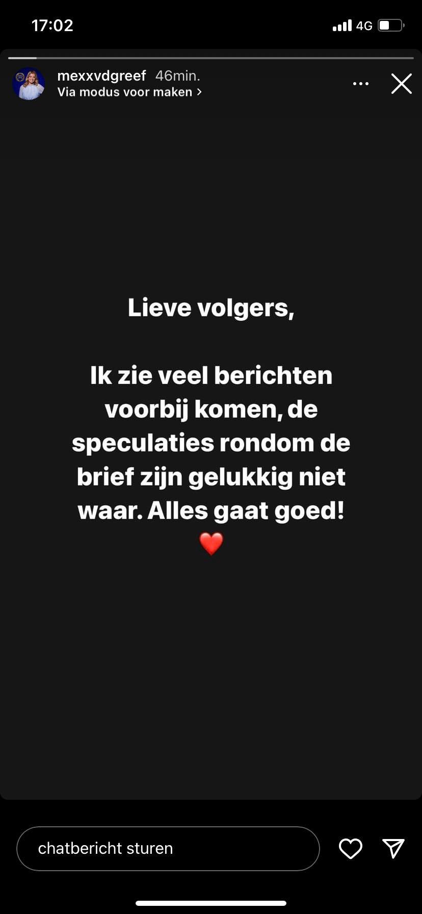 Maar daar is niets van waar, lijkt het nu. Op Instagram meldt Mexx namelijk dat alles goed met haar gaat. Volgens haar ‘zijn alle speculaties rondom de brief gelukkig niet waar’. Wat er dan wél aan de hand is, meldt de blondine niet.