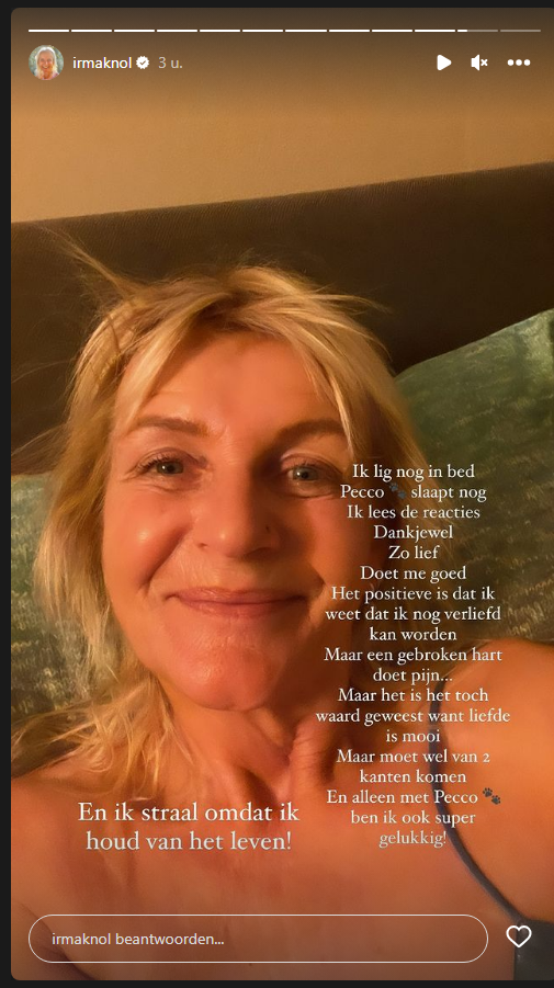 Nadat bekend werd dat het niet heeft gewerkt tussen Irma en Bart, schreef de moeder van Enzo Knol een bericht. “Ik lees de reacties. Dankjewel, zo lief, doet me goed. Het positieve is dat ik weet dat ik nog verliefd kan worden, maar een gebroken hart doet pijn…”