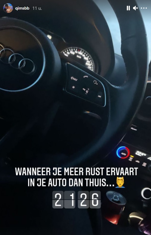 Op Instagram plaatst Quentin namelijk in zijn story: “Wanneer je meer rust ervaart in je auto dan thuis..” Als er problemen zijn met Channah, trekt Q zich wel vaker terug in zijn bolide. De vorige keer reed hij zelfs helemaal naar Parijs, terwijl Channah geen flauw idee had waar hij was.