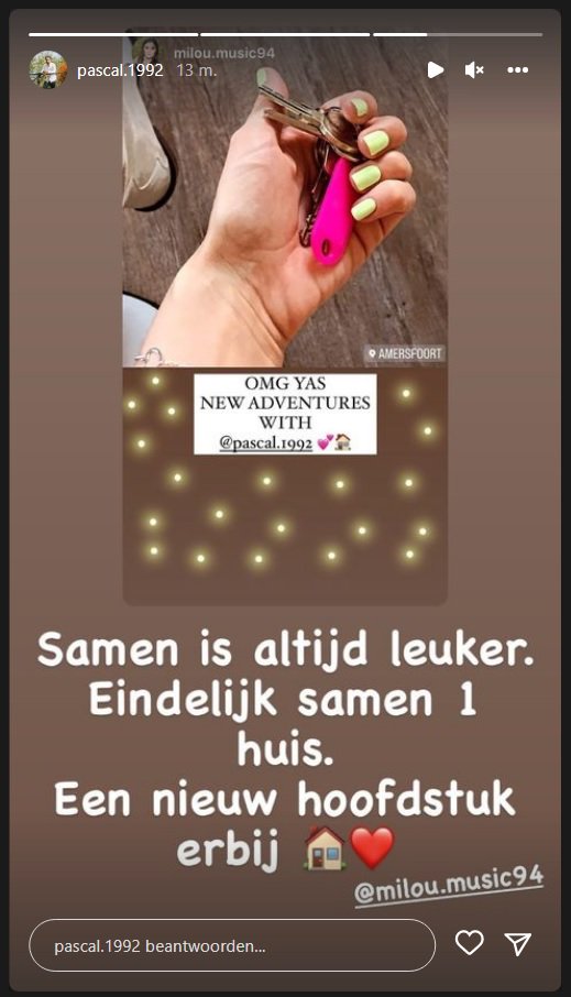 En dat gaat goed. Sterker nog: ze gaan spoedig samenwonen! Getuige de hashtag #doeidriebergen gaan ze Driebergen verlaten, Milou taggt in haar Storypost Amersfoort. “Een nieuwe plek. Om eigen te maken. Een nieuwe plek. Om gewend te raken. Een nieuwe plek. Om kleur te geven. Maar vooral om samen. Het leven te leven”, schrijft Pascal filosofisch bij een kiekje met zijn lover.