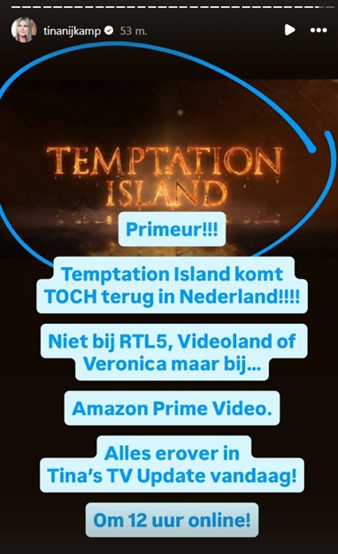 Eind september in Tina’s TV Update voorspelde Nijkamp al: “Het zou mij niet verbazen als Temptation Island in Nederland dan terug komt bij bijvoorbeeld Amazon Prime. Zij zijn heel erg veel bezig met reality, hebben veel titels in dat genre lopen. Veel succesvolle titels ook, zoals Good Luck Guys en Nowhere To Hide, Hakken over de Sloot.. Daar zou het wel tussen passen. Ik weet alleen niet of hun Amerikaanse moedermaatschappij hier voor in is.” Ze heeft nu dus gelijk gekregen.
