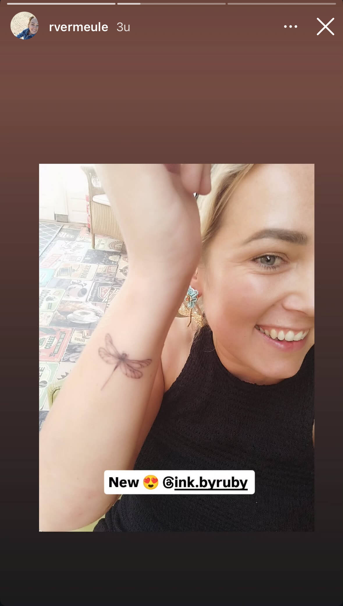 Op haar Instagram Story plaatste Renske een foto waarop ze haar arm toont. Daar heeft ze een nieuwe tatoeage laten plaatsen. Op haar arm prijkt vanaf nu voor altijd een libelle. Hieronder zie je hoe die tatoeage eruit ziet.