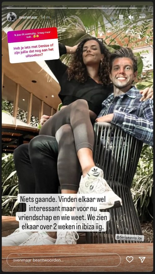 Op Instagram kreeg hij de vraag: “Heb je iets met Denise of zijn jullie dat nog aan het uitzoeken?” Zijn antwoord is ietwat mysterieus. “Niets gaande. Vinden elkaar wel interessant, maar voor nu vriendschap en wie weet. We zien elkaar over twee weken in Ibiza in ieder geval”, aldus Sven.