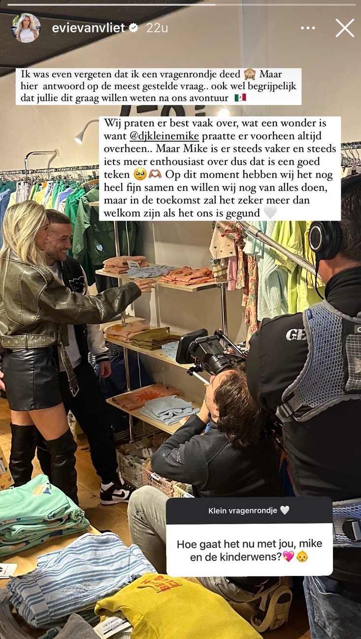 Aan het eind van de rit waren ze wel wat dichter bij elkaar gekomen; Mike is al iets meer richting ‘kamp-kindjes-krijgen’ opgeschoven. Toch is Evie nog altijd niet zwanger. Hoe zit het nu precies? Daar vertelt Evie over op Instagram.
