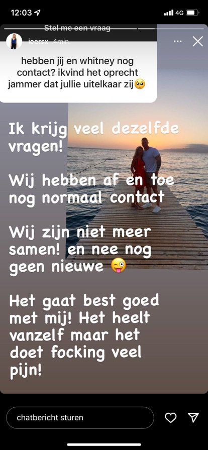 Whitney gaf al aan dat hij er alles voor over zou hebben om Iris voor zich terug te winnen. Dat lijkt er echter niet in te zitten. Tijdens een Question- & Answersessie op Instagram schenkt Iris klare wijn over de status.