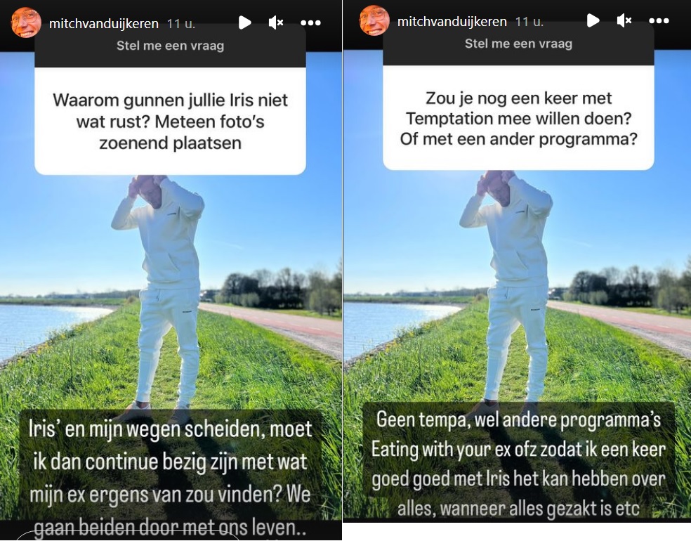 Op Instagram hield Mitch zondagavond een Question- & Answersessie om alle prangende vragen van zijn fans te beantwoorden. Zo vertelt Mitch onder meer dat het huis dat hij met Iris samen had vooralsnog niet verkocht gaat worden, omdat Iris er graag wil blijven wonen. Verder heeft hij nog niet officieel een relatie met Vera. “Er is nog geen stempel opgeplakt. Waarom niet? Omdat zij mij nog niet als vriendje heeft gevraagd!”