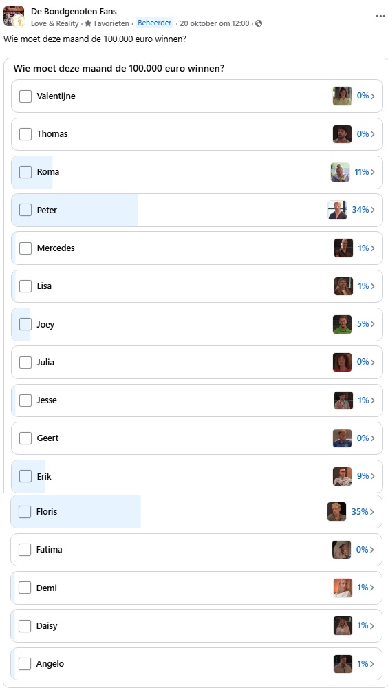 Cyclus 23 is nog niet zo heel lang bezig, maar her en der kan wel al een balans opgemaakt worden. Zo vroeg LoveReality in de Bondgenoten-Facebookgroep aan de kijkers thuis wie zij eigenlijk de 100.000 euro het meeste gunnen? Er vormde zich een bijzonder afgetekende top-drie, na (op het moment van het schrijven van dit artikel) ongeveer 3900 stemmen.