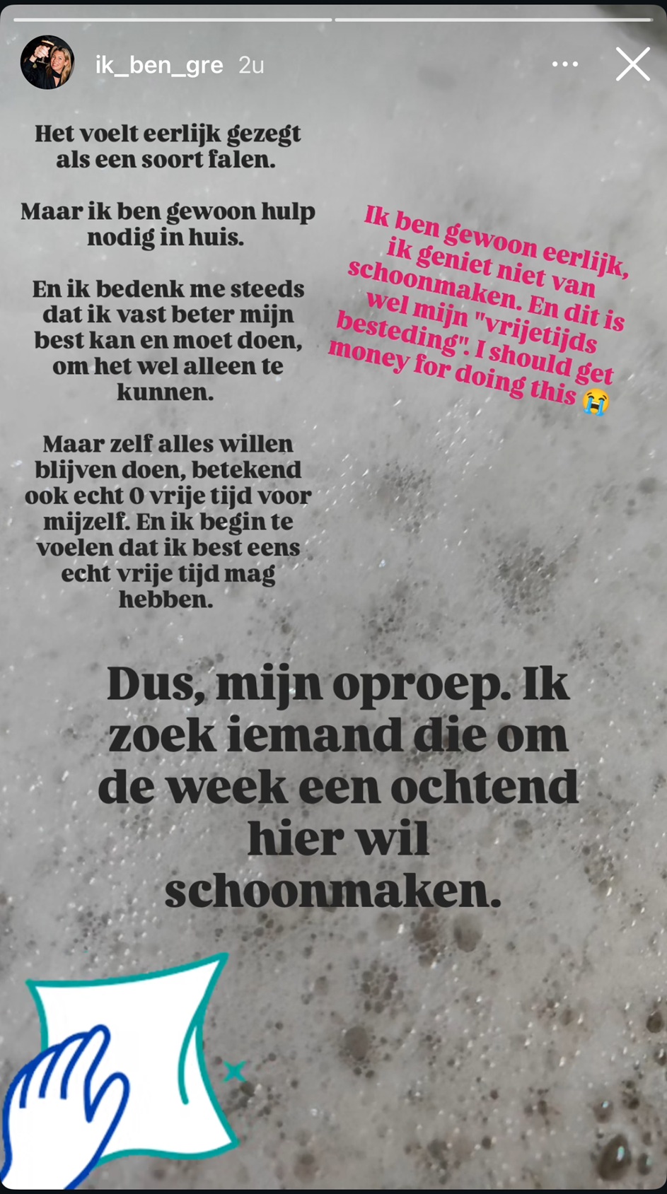 “”Het voelt eerlijk gezegd als een soort falen, maar ik heb gewoon hulp nodig in huis”, opent Greetje. “En ik denk steeds dat ik vast beter mijn best kan en moet doen, om het wél alleen te kunnen.. Maar zelf alles blijven willen doen, betekent ook echt nul vrije tijd voor mezelf. En ik begin te voelen dat ik soms best eens vrije tijd mag hebben.”
