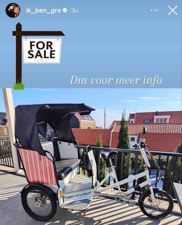 Inmiddels is dat dus anders. Want via Instagram laat Greetje weten dat de riksja te koop is. Velen vroegen zich af waarom. Komt het door haar nieuwe werk dat ze er geen tijd meer voor heeft, vindt ze het toch niet zo leuk of komen haar plannen niet van de grond. Er blijkt een andere reden te zijn, zo laat Greetje zelf weten. “Vanwege de vele dm’s met de vraag waarom. Ik heb geen stalling voor de fiets.”