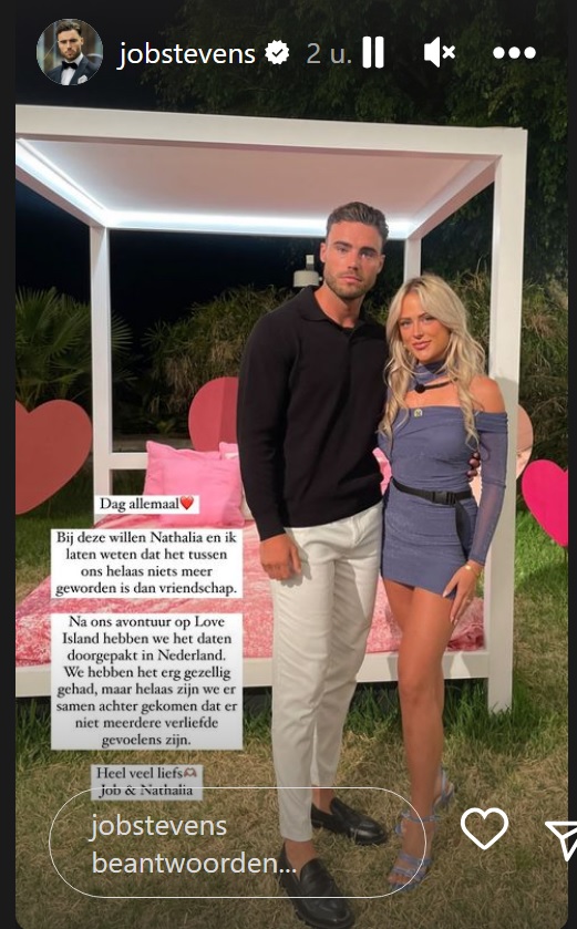 Aldaar schrijft Job: “Bij deze willen Nathalia en ik laten weten dat het tussen ons helaas niets meer geworden is dan vriendschap. Na ons avontuur op Love Island hebben we het daten doorgepakt in Nederland. We hebben het erg gezellig gehad, maar helaas zijn we er samen achter gekomen dat er niet meerdere verliefde gevoelens zijn. Heel veel liefs, Job en Nathalia.”