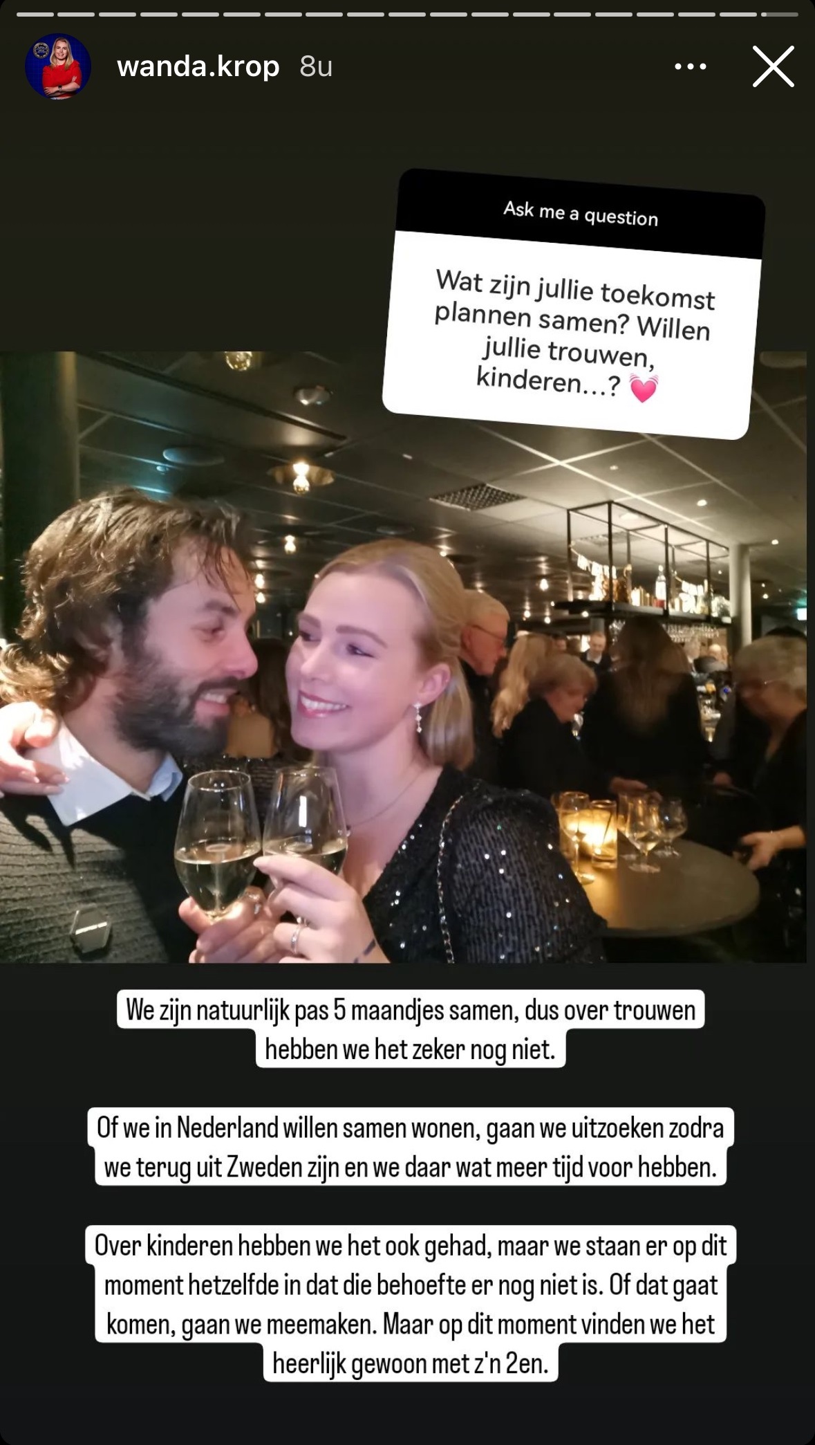 Een fan vraagt aan Wanda of ze al denken aan hun toekomst, met bijvoorbeeld trouwen en kindjes? “We zijn natuurlijk pas vijf maandjes samen, dus over trouwen hebben we het zeker nog niet. Of we in Nederland willen samenwonen, gaan we nog uitzoeken zodra we terug uit Zweden zijn en we daar meer tijd voor hebben.”