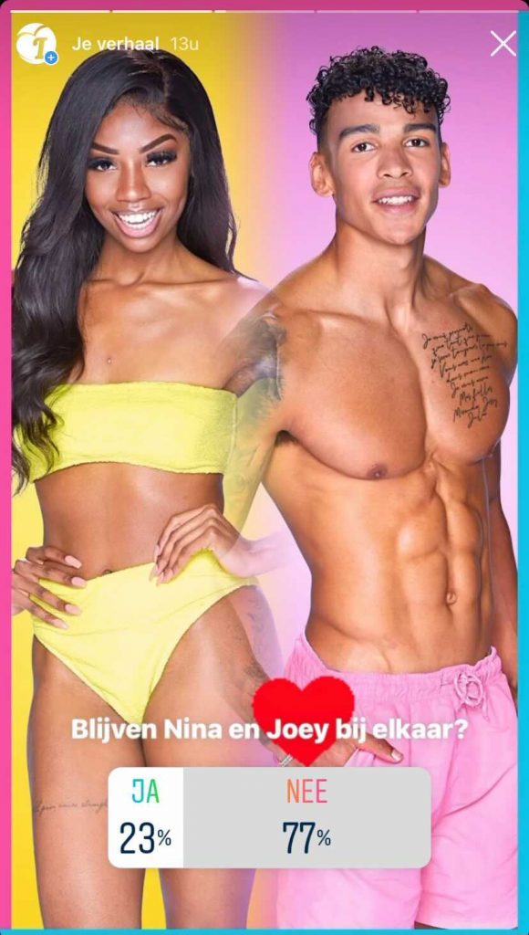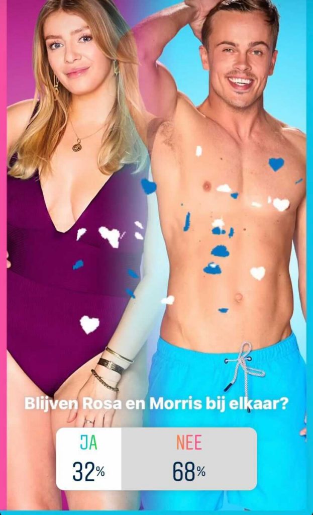 Wij vroegen aan de trouwe lezers van LoveReality per koppel de simpele vraag: ‘Zie jij deze twee bij elkaar blijven?’ Het meeste vertrouwen was er nog in Rowenna en Job (56% stemde ‘ja’), maar inmiddels zijn zij al weer uit elkaar (gehaald). Esmee sloeg namelijk toe en kaapte Mr Blue Eyes.