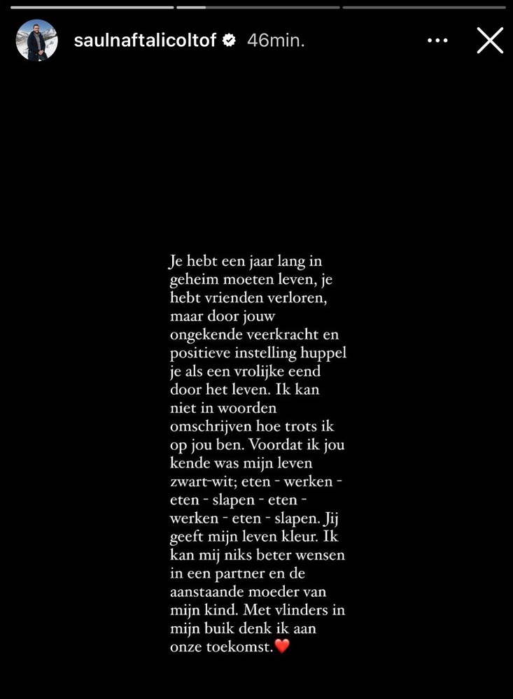 Vrijdagochtend maakte Amy Rose wereldkundig dat ze in verwachting is van haar eerste kindje, samen met Saul. Laatstgenoemde reageert via zijn Instagram Story op het heugelijke nieuws en steekt volop de loftrompet uit voor Amy Rose, die hij leerde kennen in Winter Vol Liefde.