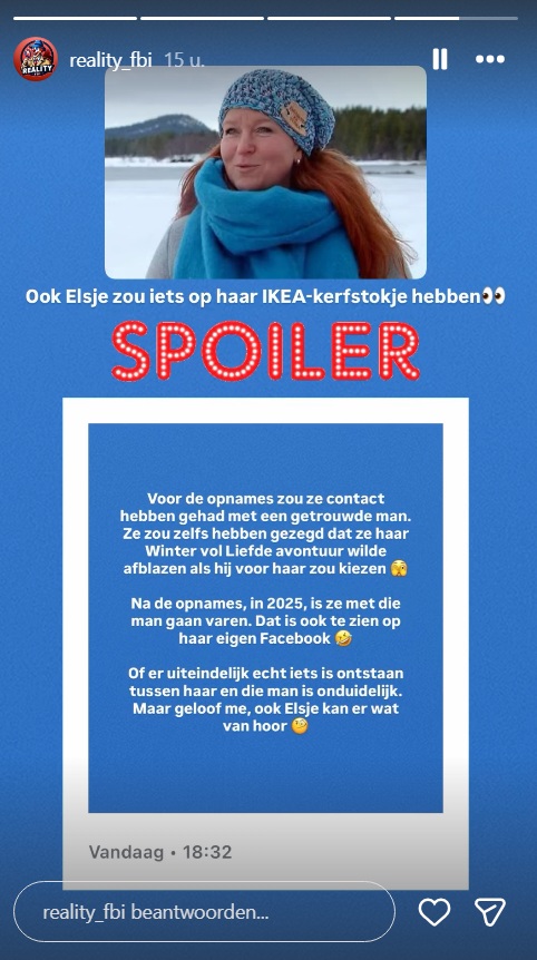 Dit kanaal schrijft dat Elsje vlak voor Winter Vol Liefde nog contact had met een getrouwde man. Elsje zou zelfs aan hem hebben beloofd dat ze voor hem wel de stekker uit haar WVL-deelname wilde trekken. “Of er uiteindelijk echt iets is ontstaan tussen haar en die man, is onduidelijk”, klinkt het nog…
