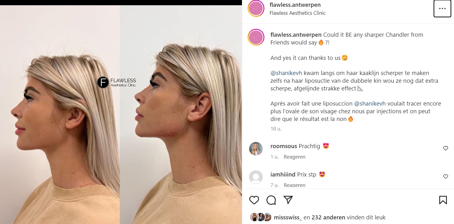 Op Instagram meldt de filler- en botoxkliniek: “Shani kwam langs om haar kaaklijn scherper te maken. Zelfs na haar liposuctie van de dubbele kin wou ze nog dat extra scherpe, afgelijnde strakke effect.”