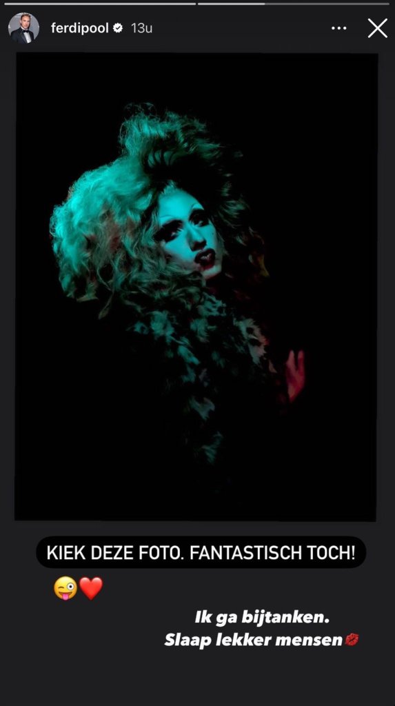 Op Instagram deelt Ferdi een before- en afterfoto. Hij is opgemaakt als heuse dragqueen! En één van de bekendste dragqueens van Nederland, Envy Peru, lovet het. “Meittie! Eeenig! Hoe heet ze haha?” Waarop Ferdi reageert: “Francisca Zwembad schat.” Ook ceremoniemeester Gordon komt voorbij in de comments: “Geweldig!”