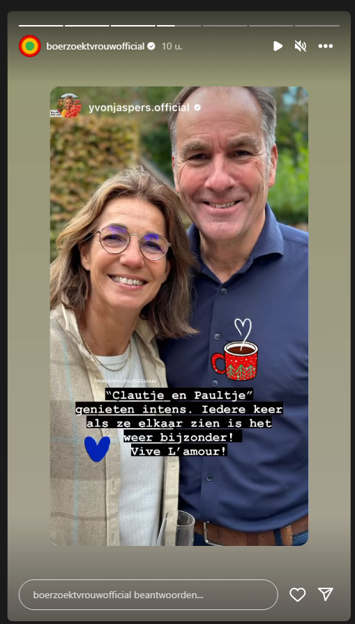 Recent vertelde Claudia al op de website van de KRO-NCRV dat ze elkaar om de week in het weekend zien. “En dan meestal dat Paul bij mij is. Voor mij is het toch wat lastiger om mijn werk achter me te laten. Ik ben al wel een keer bij hem geweest om zijn zoon en dochter te ontmoeten en de sfeer daar te proeven. En afgelopen weekend was ik ook bij hem. We willen ook niet te hard van stapel lopen en vinden het fijn dat we ons eigen ding hebben.” Eerder gaf Yvon ook al een update over Boer Haico en Ellen, alsook over de alleen achtergebleven Bernice.